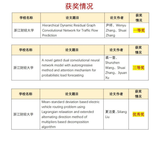 21级管理科学与工程专业三位研究生积极参与了本次论坛并进行了论文的在线宣读。最终,21级管理科学与工程专业研究生尹祥提交的论文“Hierarchical Dynamic Residual Graph Convolutional Network for Traffic Flow Prediction”荣获一等奖,21级管理科学与工程专业研究生裘一蕾提交的论文“A novel gated dual convolutional neural network model with autoregressive method and attention mechanism for probabilistic load forecasting”荣获三等奖,21级管理科学与工程专业研究生夏洁曼提交的论文“Mean-standard deviation based electric vehicle routing problem using Lagrangian relaxation and extended alternating direction method of multipliers based decomposition algorithm”荣获优秀奖。