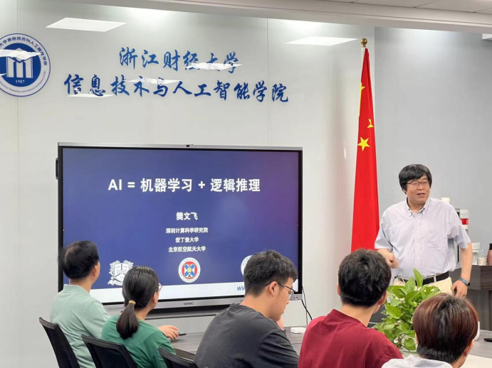 樊文飞教授研究涉及数据库理论与系统、人工智能、大数据等多个领域。在此次讲座上,樊文飞教授重点探讨了人工智能中逻辑推理和机器学习的融合问题,并提出了基于图数据关联规则的逻辑框架,通过实际案例展示了这一框架在新药研发、智能制造、网络安全和信贷风控等领域的应用成效。这些成果展示了以人工智能技术为代表的新质生产力在各领域的广泛应用及其对行业转型升级的驱动作用。