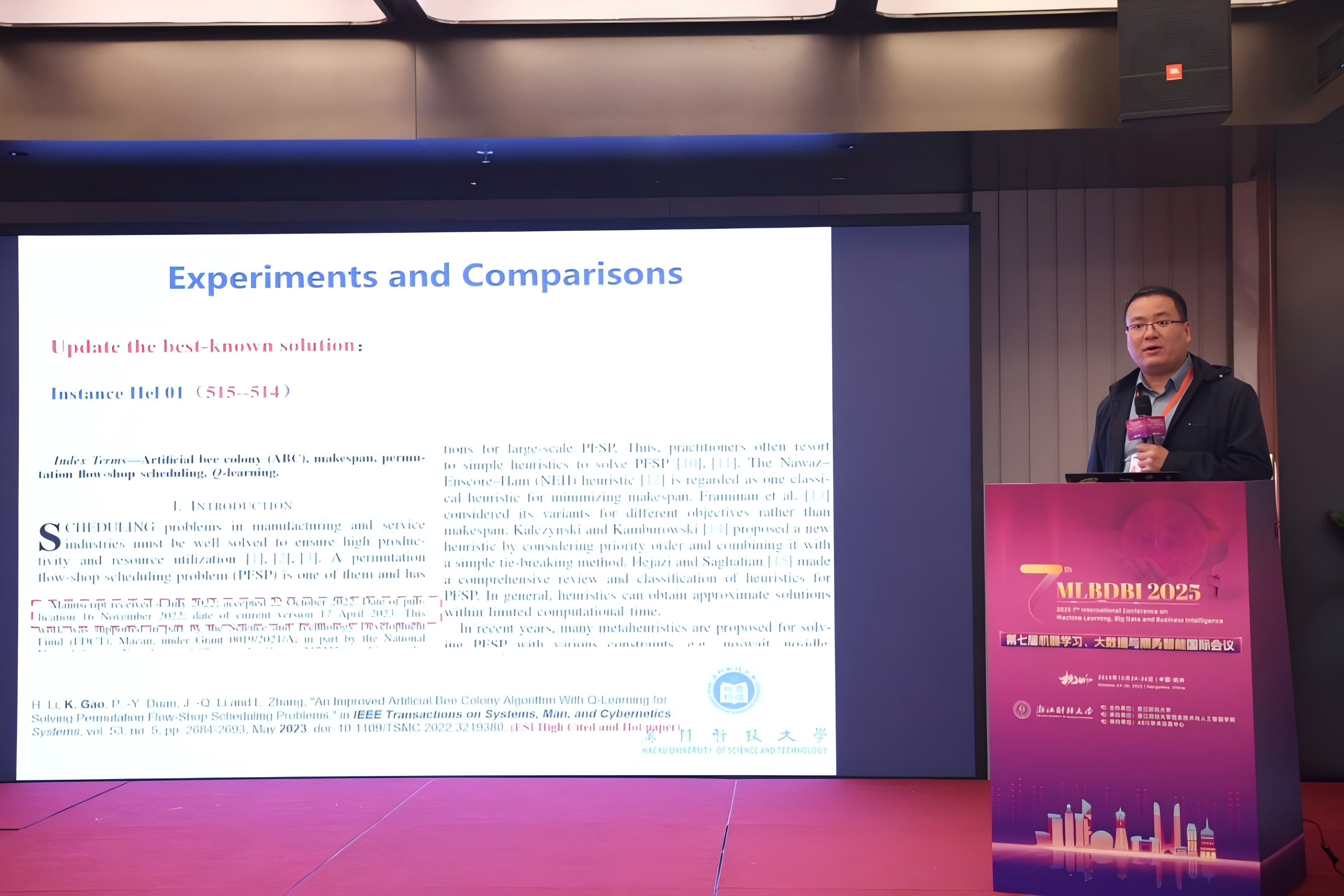武汉大学王峰教授以“生成式模型驱动的动态多目标进化算法”为题,深入探讨了生成式模型在动态多目标优化中的应用。大连海事大学白丹宇教授则聚焦“面向流水作业的调度模型与算法分析”,为与会者呈现了智慧港航调度领域的最新研究成果。澳门科技大学高开周教授的报告“学习引导的进化和群智能算法求解复杂优化调度问题”,展示了人工智能与优化算法的深度融合。浙江工商大学毛郁欣教授以“基于大模型微调的电商消费者评论挖掘”为题,分享了文本挖掘在网络消费者行为分析中的创新应用。