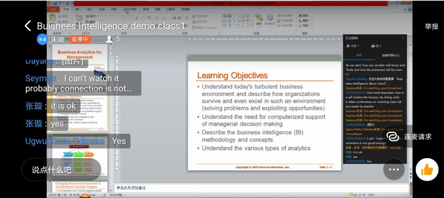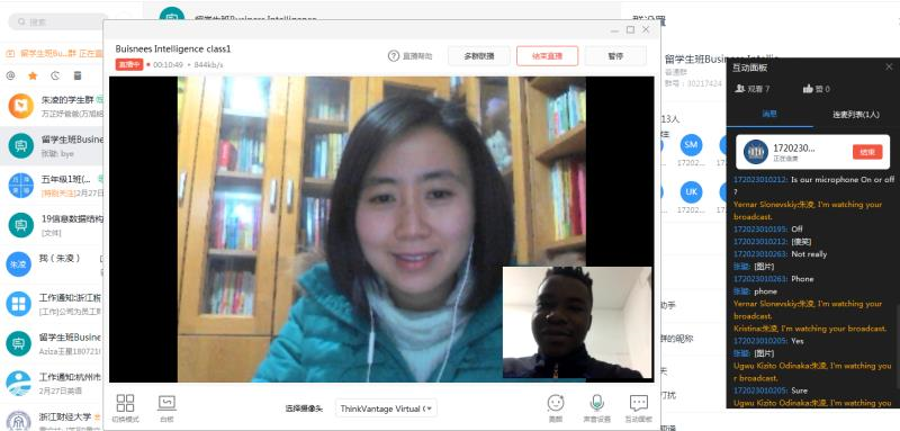 留学生《Business Intelligence》和《Business Data Analysis & Practice》等课程的线上教学任务。虽在讲台上授课已经轻车熟路,但“从一线教师变成十八线网络主播”的在线直播授课,朱凌老师坦言还是第一次,特别是之前讲台下一双双渴求知识的大眼睛,如今变成了电脑上一颗颗闪烁光芒的小摄像头,作为一名互联网+时代的老师,这不仅是压力,也是挑战。