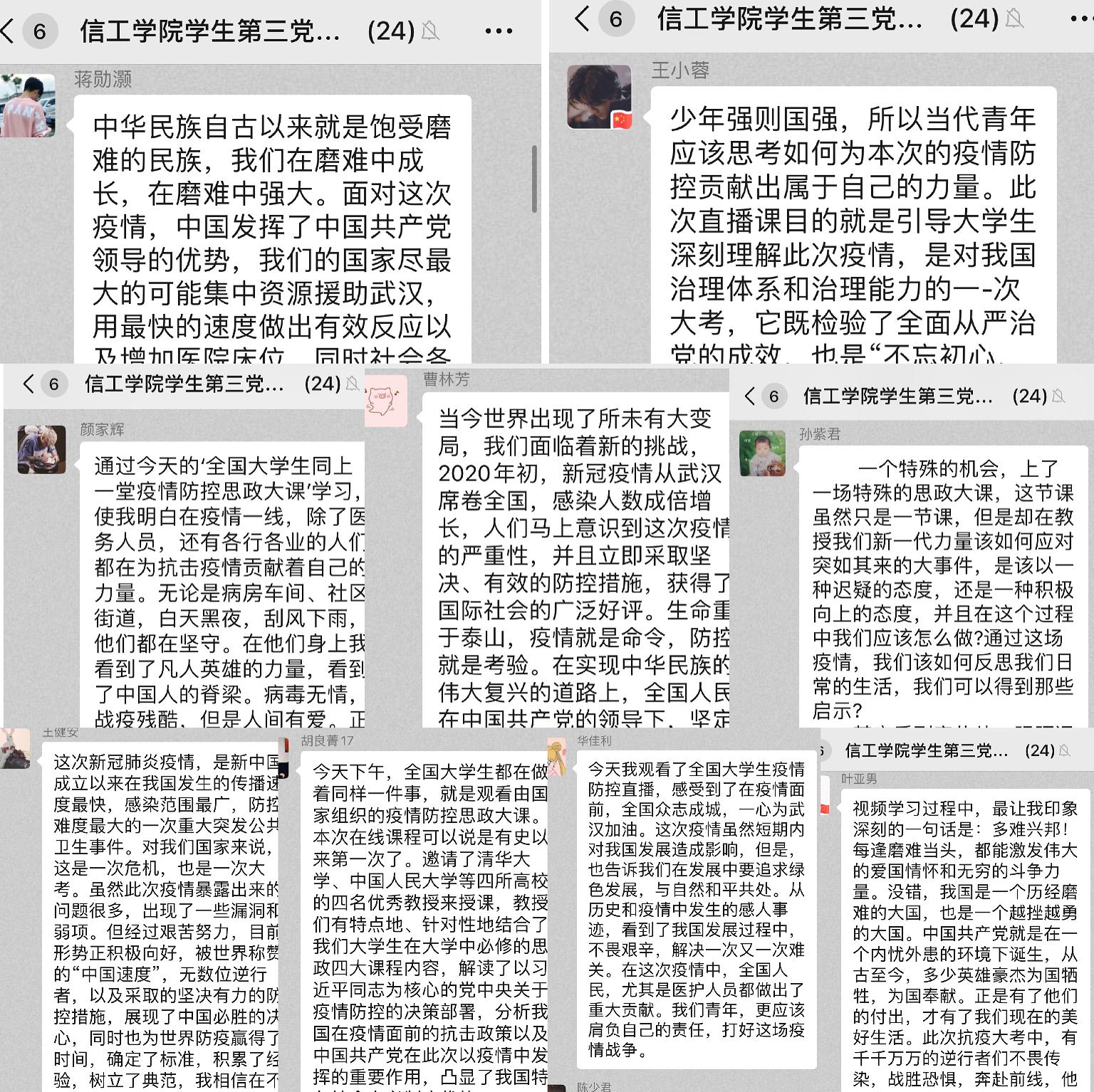 学生第三党支部书记毛立晨:此次抗疫大考中,有千千万万的逆行者们不畏传染,战胜恐惧,奔赴前线,他们在战场上表现出来的青春力量和大无畏精神是值得每位大学生学习和思考。青年们应当明确自己的责任与担当,坚持与全国人民同呼吸,共命运!坚决打好这场防控防疫阻击战,为人民为国家贡献自己的力量。
