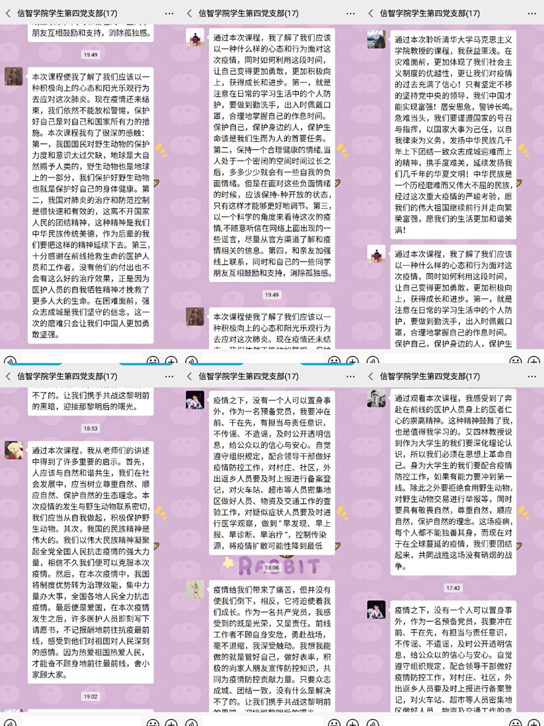 学生第一党支部书记吕挺:在全球一体化的今天,任何国家都无法从一次突发的疫情或灾难中脱离自身。这次疫情,不仅是中国受到伤害,而作为重量级国家,目前来看全球都因为疫情受到严重影响。而我也从来都相信,中国一定会战胜疫情,继续保持一个负责任的大国形象,为全人类的进步做出自己的贡献。