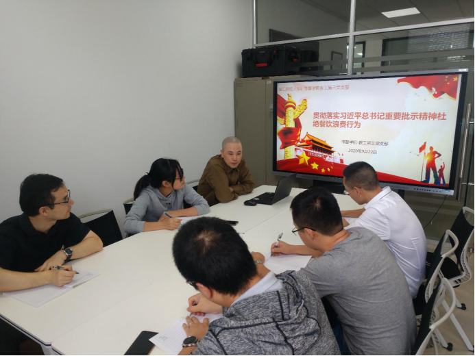 教工第三党支部于9月22日召开“贯彻落实习近平总书记重要批示精神 杜绝餐饮浪费行为”的支部党员大会,会议由支部书记杨水清主持,支部成员参加。