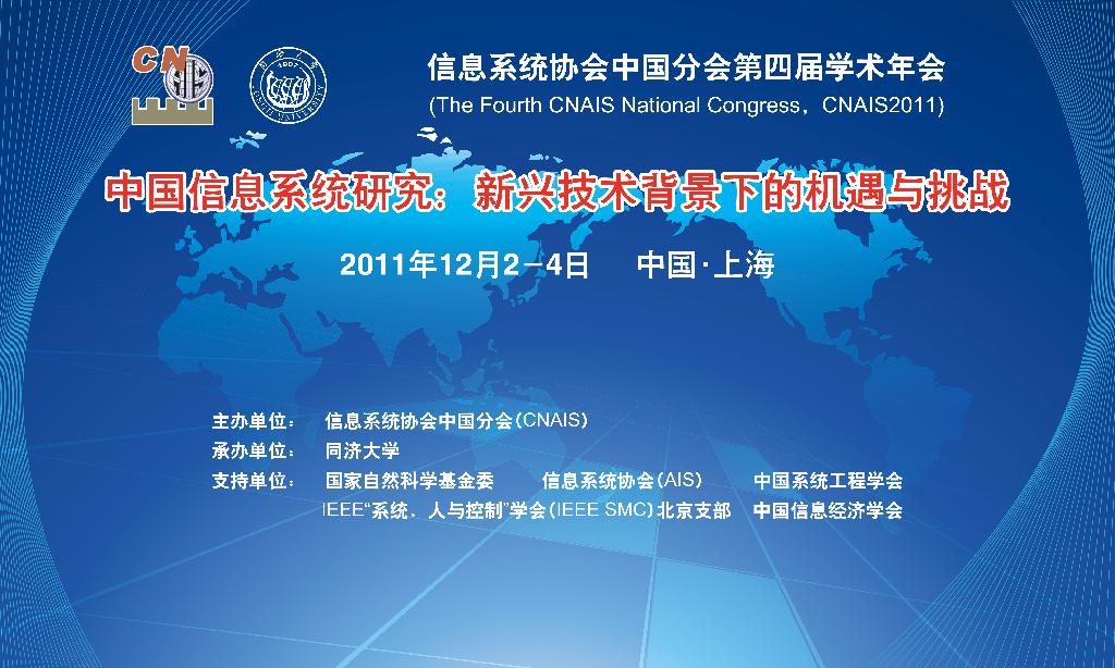 12月2日-4日,信息系统协会中国分会CNAIS在上海成功举办了第四届全国大会(CNAIS2011),会议由同济大学承办,主题为“中国信息系统研究:新兴技术背景下的机遇与挑战”。棋牌 APP