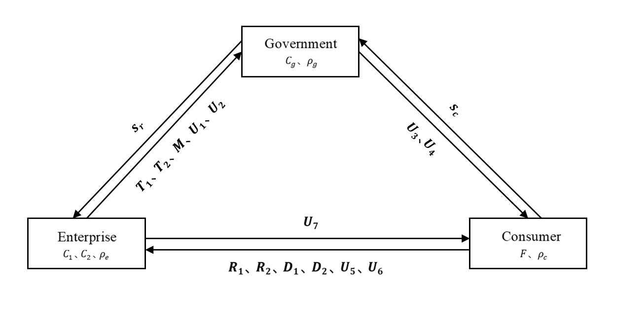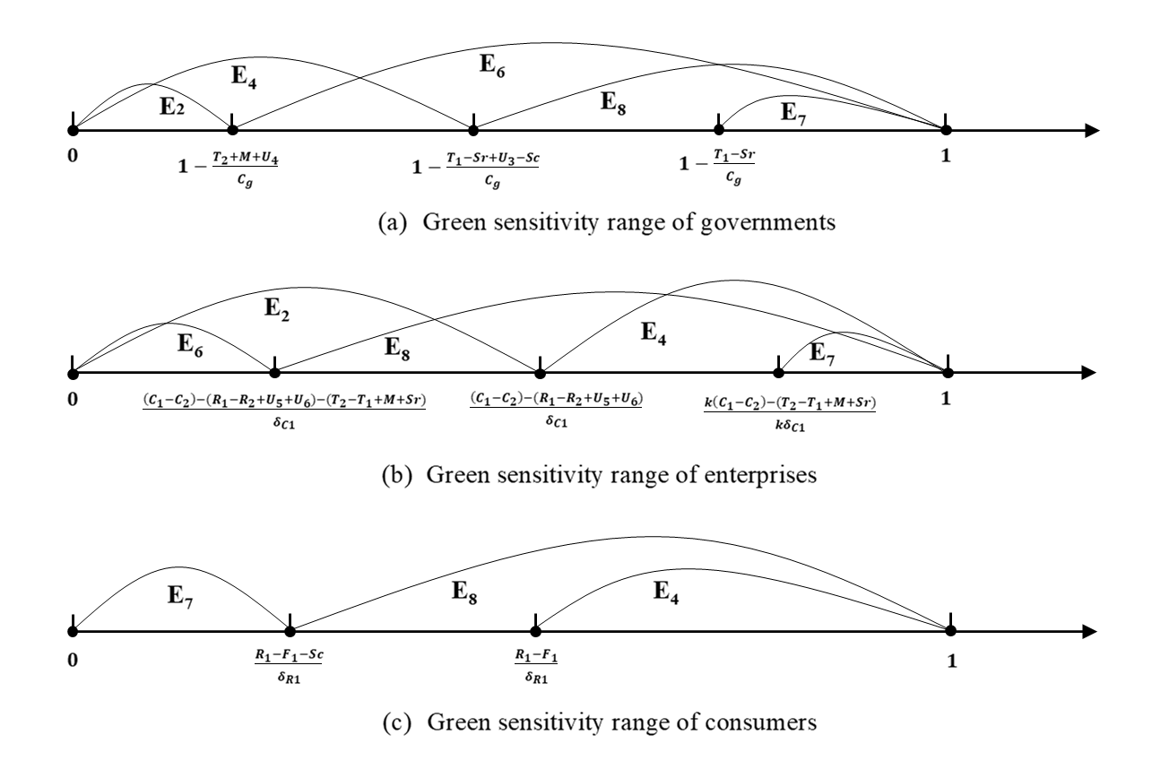 该论文在综合考虑绿色供应链中多政策因素基础上,创造性地提出了具有绿色敏感的政府、企业和消费者三方参与主体的演化视角,创新发展了现有绿色供应链演化博弈模型(图一),通过求解不同绿色敏感度下的演化稳定均衡点(图二)及其稳定条件并进行数值模拟(图三为例),比较分析不同绿色敏感度和不同政策因素对系统演化稳定均衡的影响。