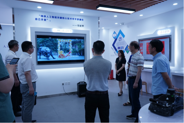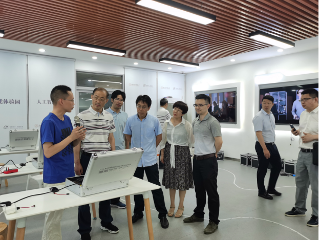实验中心姜海银老师向来访嘉宾介绍了棋牌 APP 人工智能体验园的发展历程、项目构成、教学与实践安排,分享了人工智能体验园运行安排以及所开展的机器人讲党史、VR红色之旅和机器人走长征等党建活动。