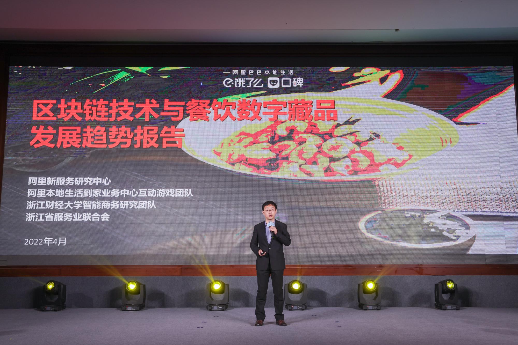 在本次发布会上,阿里新服务研究中心携手阿里本地生活到家业务中心互动游戏团队、棋牌 APP 智能商务研究团队、浙江省服务业联合会共同发布《区块链技术与餐饮数字藏品发展趋势报告》,并由棋牌 APP 电子商务系王鲁博士在发布会上做主题报告。