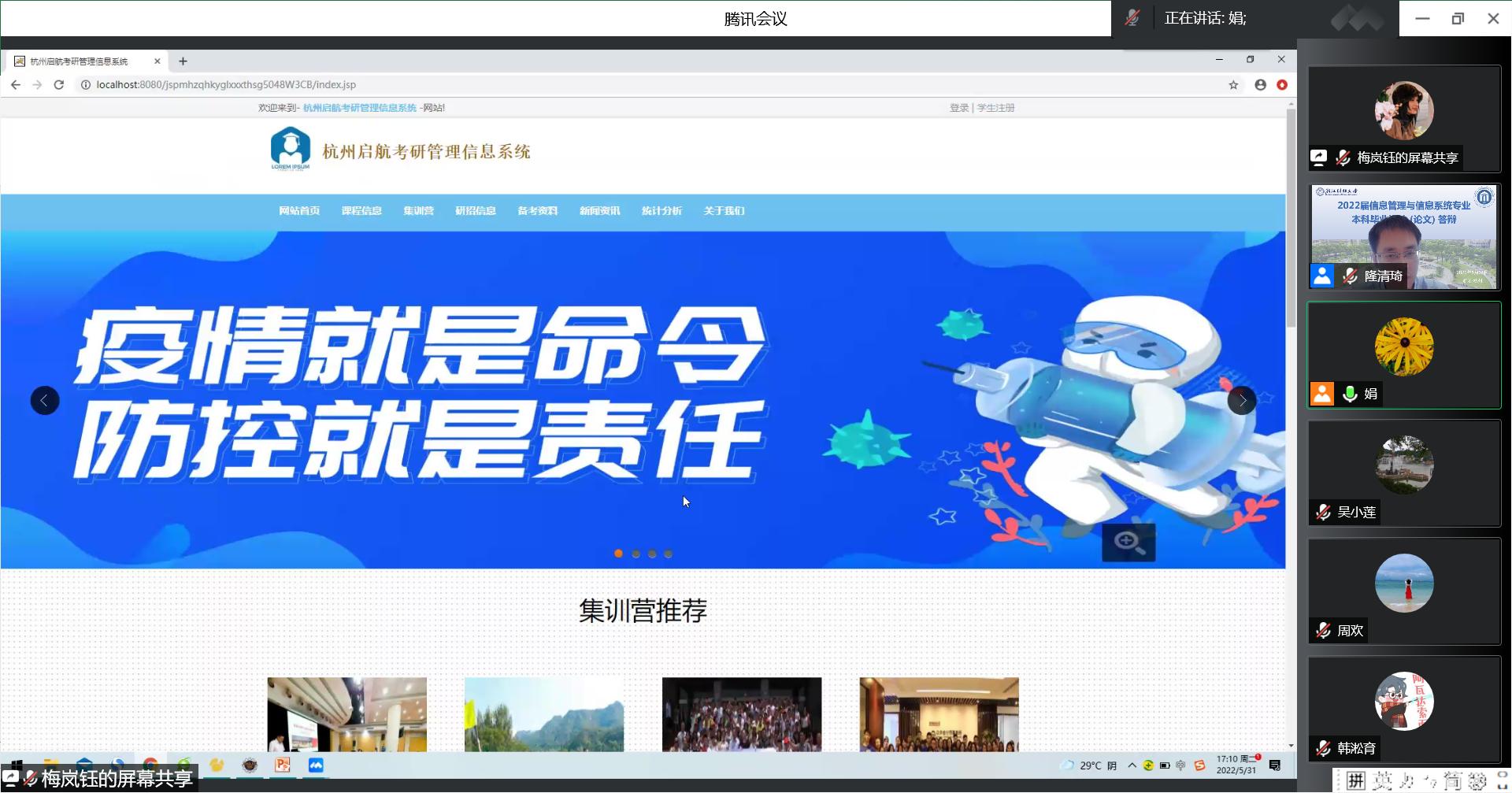 答辩环节中,每位答辩学生首先汇报答辩PPT,然后演示系统或模型计算,最后回答答辩组专家和老师提出的问题。答辩组老师针对学生毕业论文中存在的框架结构与格式规范、研究方法与结果分析、系统设计模块功能、数据表逻辑关系等各方面问题,提出了对应的修改意见。答辩组专家指出学生应从实际业务需求角度,设计系统的功能模块,论文研究结论分析需要符合实际情况,从实践角度,为学生毕业设计提出了宝贵的修改建议。