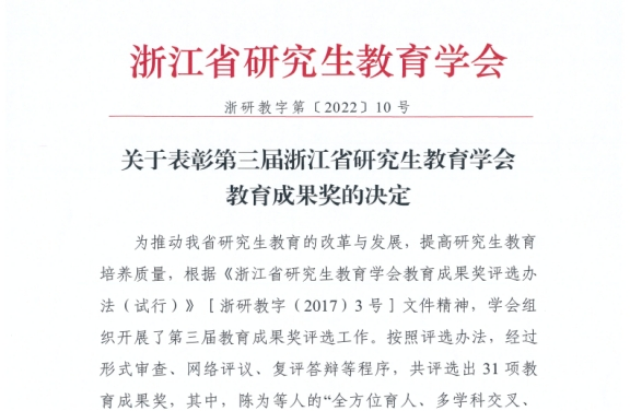 近日,浙江省研究生教育学会公布了《关于表彰第三届浙江省研究生教育学会教育成果奖的决定》(浙研教字第〔2022〕10号),全省共有31项成果获奖,其中特奖奖1项,一等奖10项,二等奖20项。由棋牌 APP