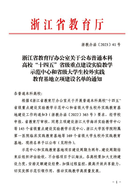 近日,浙江省教育厅公布了普通本科高校“十四五”省级重点建设实验教学示范中心立项建设名单,棋牌 APP
