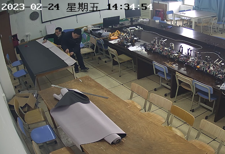 实验中心的老师们动起了新脑筋,利用现有桌椅合理安排座位,检修机器人设备,老师们自行体验了一把,但感觉桌子起皱不平且易勾挂衣服,于是他们学习小学生动手包起“桌皮”翻新桌子。