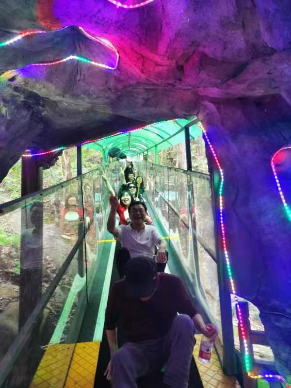 最后乘着好天色,大家赶往灵栖洞极速滑道,驾驶着一辆辆小车,从霭云洞飞奔而下,随之大呼尖叫之声此起彼伏,风驰电掣之后平稳落地,而后一簇簇人都在认真回味下山的紧张刺激。