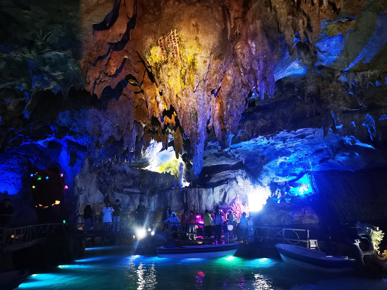 进入景区,首先来到了灵泉洞,丝丝凉意洞穴深处传来。大家纷纷坐上小木船,在技艺娴熟的船工掌舵下,划入灵栖洞,四周奇石林立,有的似“黄龙垂首”,有的似“南极仙翁”,在彩色灯光的映照下,处处色彩斑斓。
