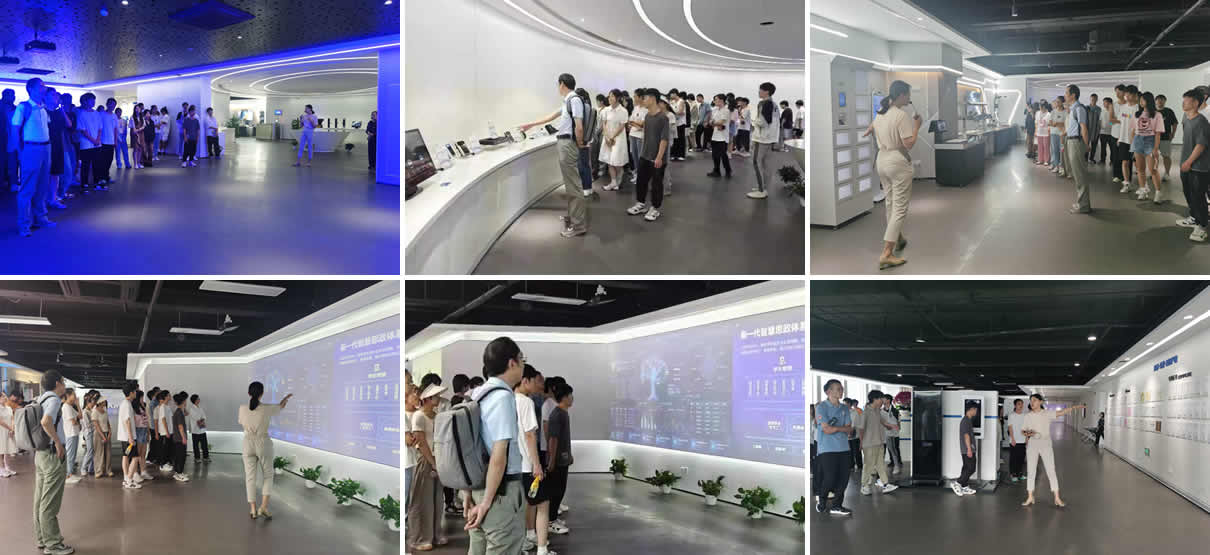 师生一行首先跟随公司解说员的步伐参观了正元智慧科技展览馆,了解公司发展历程、核心产品和棋牌APP等,近距离体验主要产品的使用场景,对AIoT技术的应用及发展前景有了更加直观的了解。