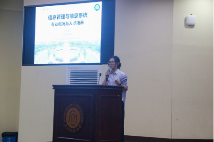 信息管理与信息系统系主任王婉茹老师,她首先概述了从1987年以来本专业所荣获的各项奖项和雄厚的师资力量。信息管理与信息系统系专业是经管与信息技术相融合,并从课程体系、就业领域、就业方向、继续深造四个方面来具体讲解了棋牌 APP