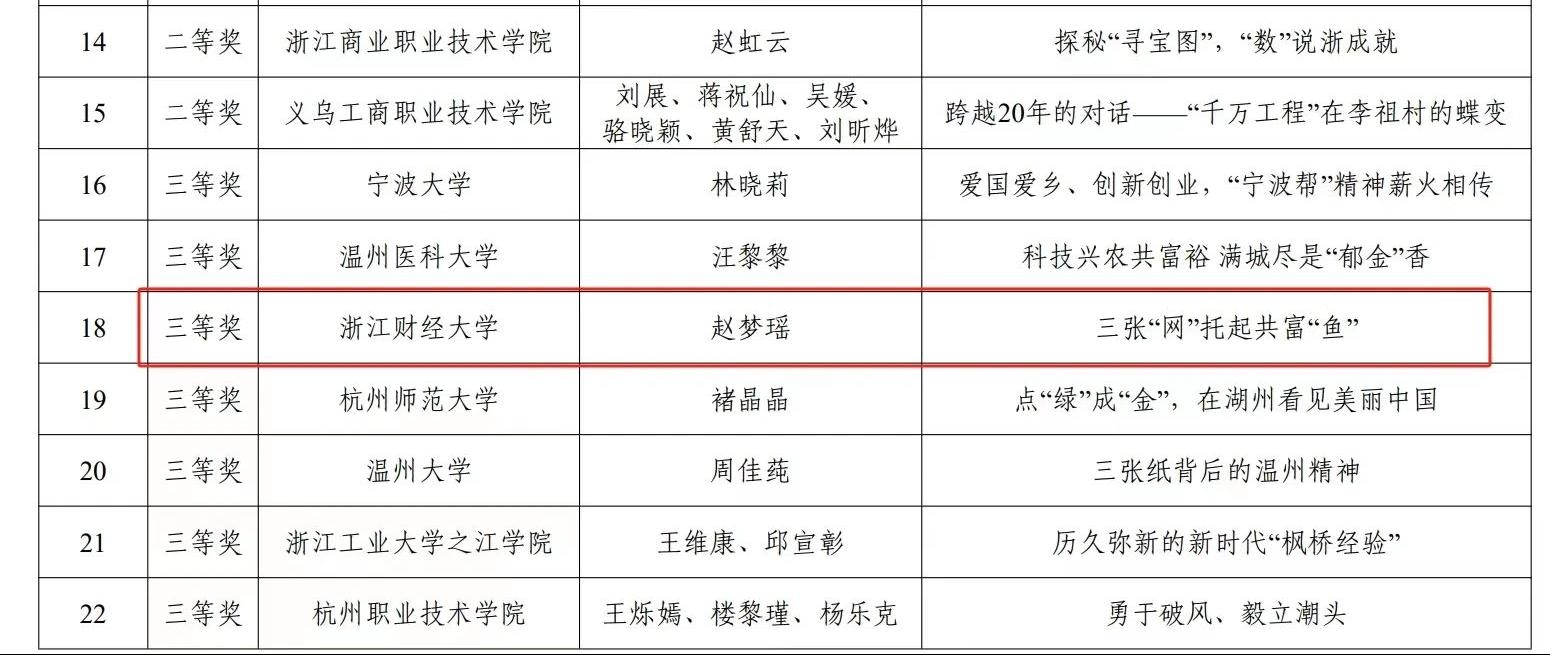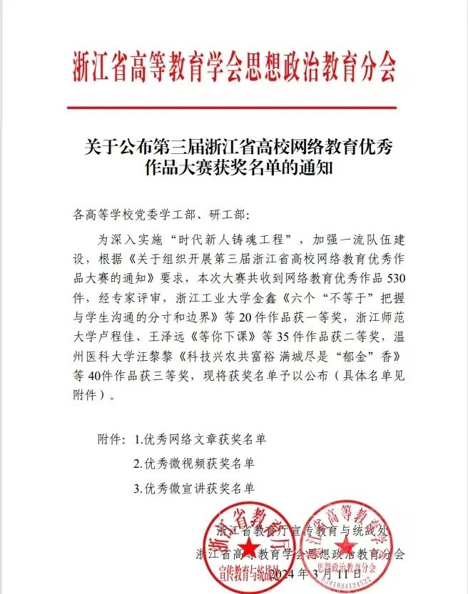 近日,由浙江省教育厅宣传教育处、浙江省高等教育学会思想政治教育研究分会组织开展的第三届浙江省高校网络教育优秀作品大赛获奖名单公布,棋牌 APP 思政辅导员赵梦瑶的作品《三张“网”托起共富“鱼”》荣获优秀微宣讲三等奖。