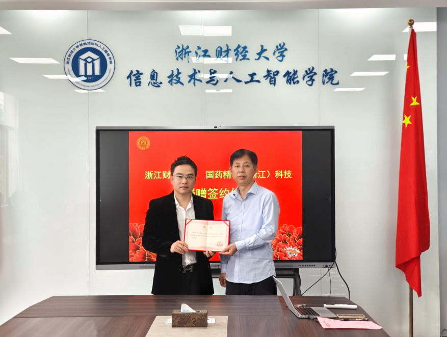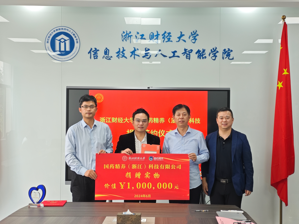 与国药精养(浙江)科技有限公司举行物资捐赠签约仪式,国药精养董事长金皇飞、校友办负责人、棋牌 APP
