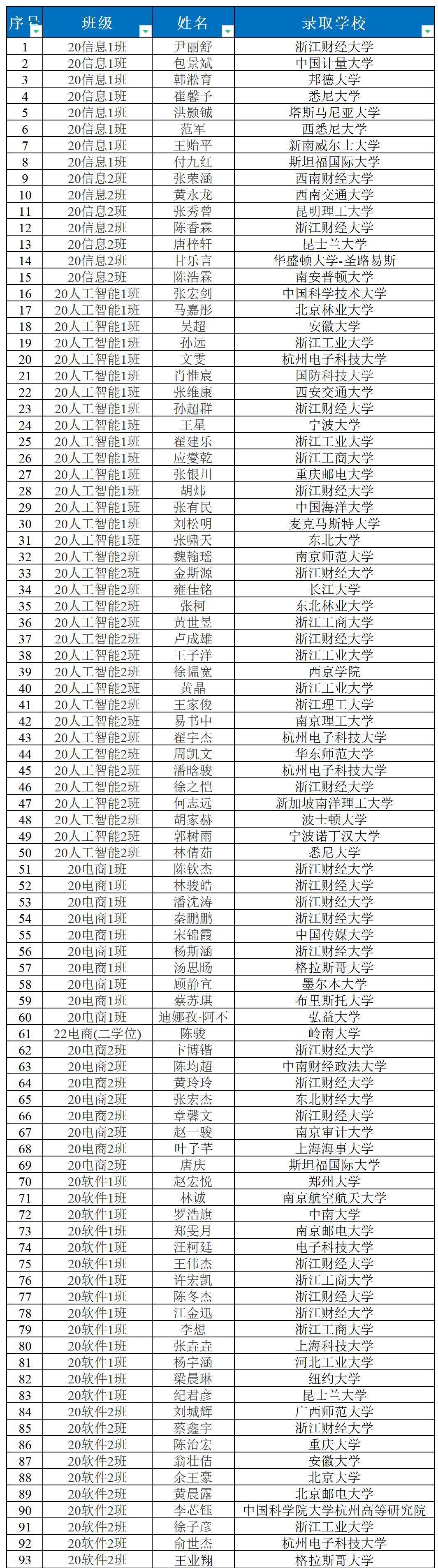 共有93人考取国内外研究生。其中,27人考取北京大学、西安交通大学、国防科技大学、中国科学技术大学等“双一流”高校,较去年同期增加8人;13人考取新加坡南洋理工大学、纽约大学等QS世界排名前100国(境)外高校。出国(境)升学数据将持续更新。