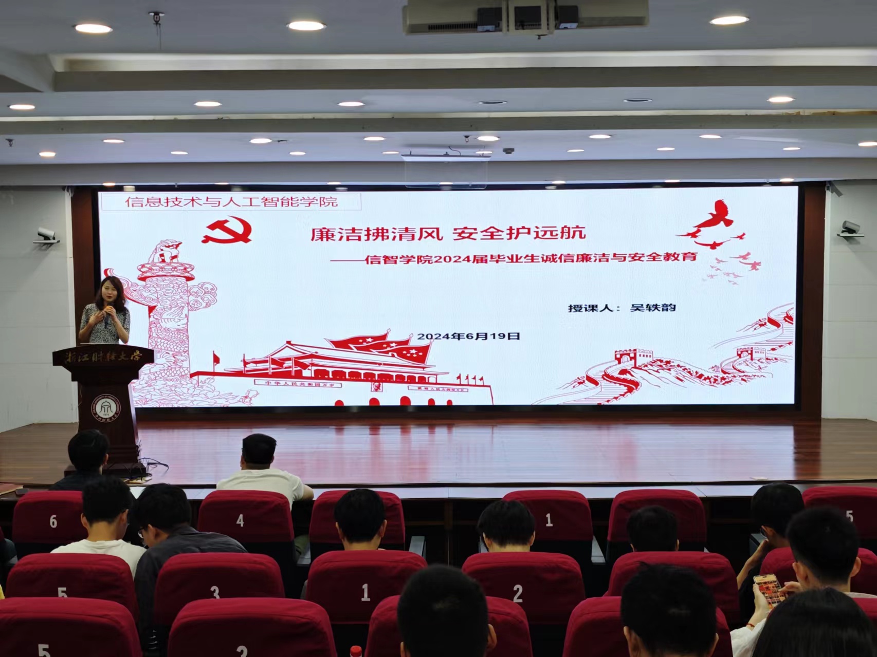 在2024年盛夏的热烈氛围中,“2024届毕业生教育动员大会暨毕业生廉洁从业教育会”成功召开。党委副书记吴轶韵、学办主任洪宝华、团委书记赵梦瑶、辅导员徐军军、史光花、吴泽勇与众多毕业生们共聚一堂,怀揣着梦想与激情,共同迈向人生的新篇章。