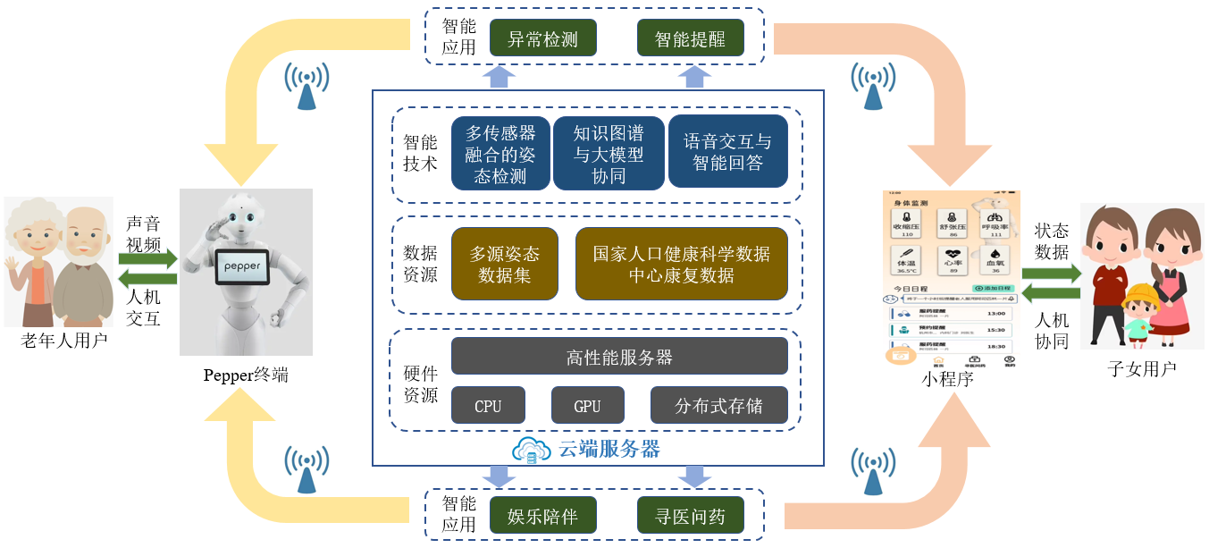 软银机器人有限公司(SoftBank Robotics)为软银集团的全资子公司,Pepper机器人作为软银机器人公司旗下极具创新性的产品,以其拟人化的设计和智能交互功能在全球范围内赢得了广泛认可。张翔团队借助这一平台,针对中国老龄化社会的具体需求,重点研究了中国老年人的养老模式,并探索了机器人如何在本土化的养老场景中实现有效的人机交互、健康监测和日常协助。展会现场,张翔和彭莉莎老师为Pepper机器人的演示提供现场技术支持,向国内外广大参展人员展示了Pepper机器人如何在养老场景中帮助老年人完成日常任务,如与老年人进行语音交流、健康提醒、生命体征监测、智能情感陪伴等功能,吸引了国内外广大观众与业界专家的关注。