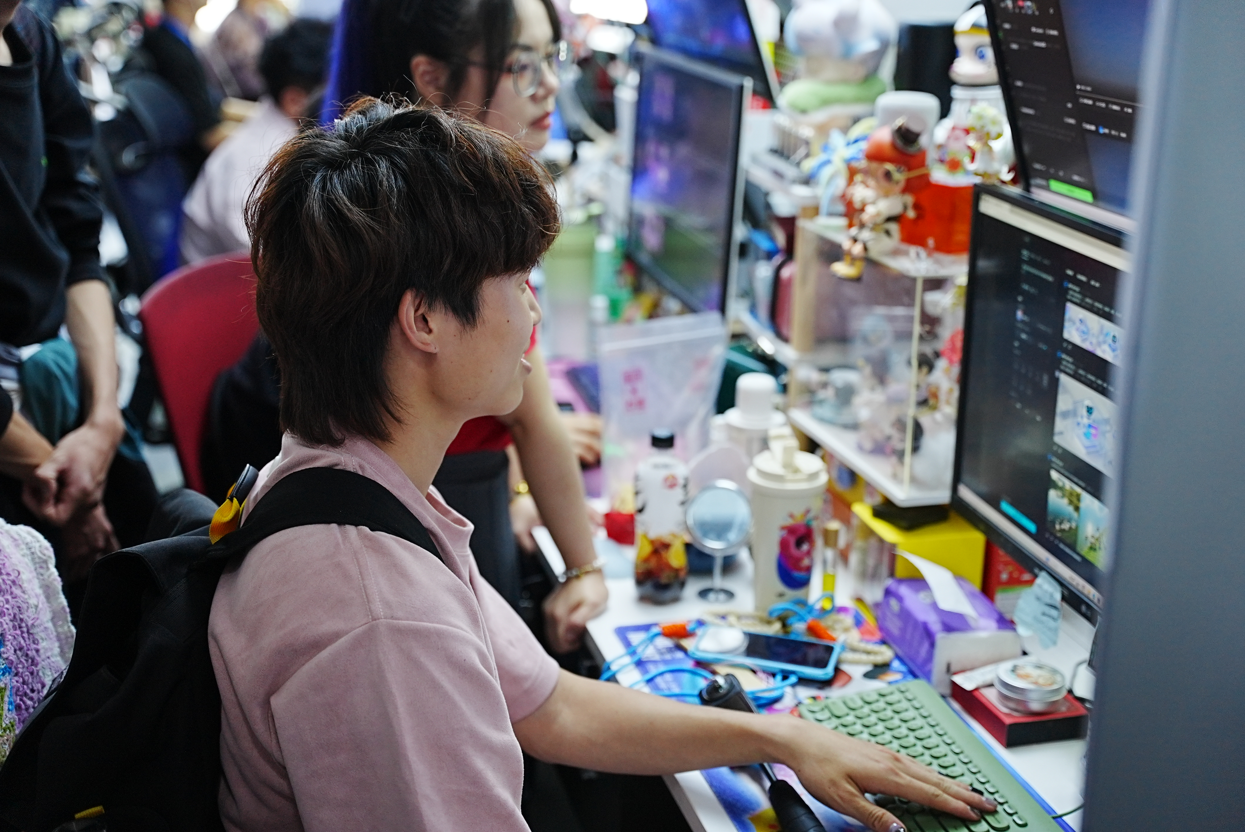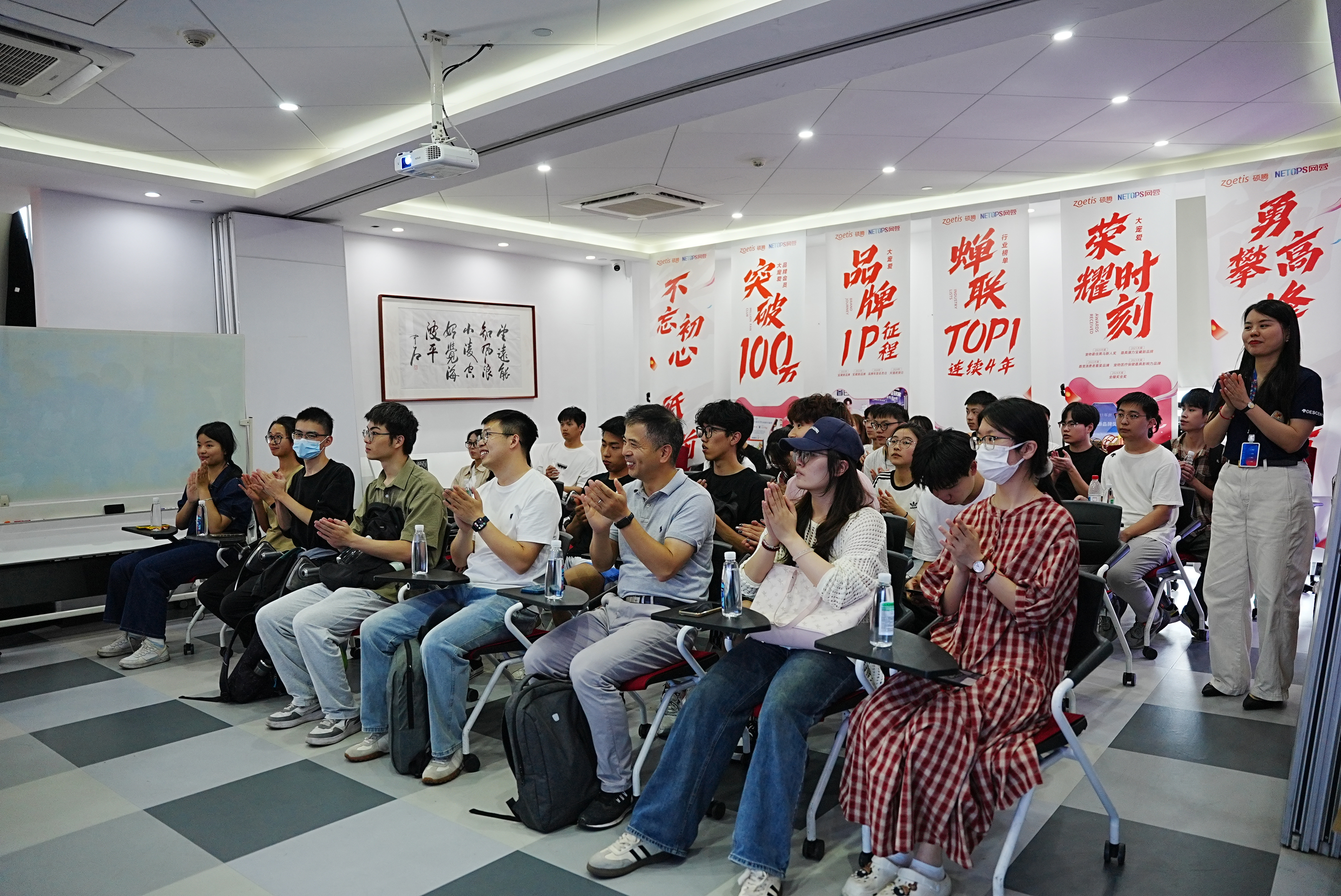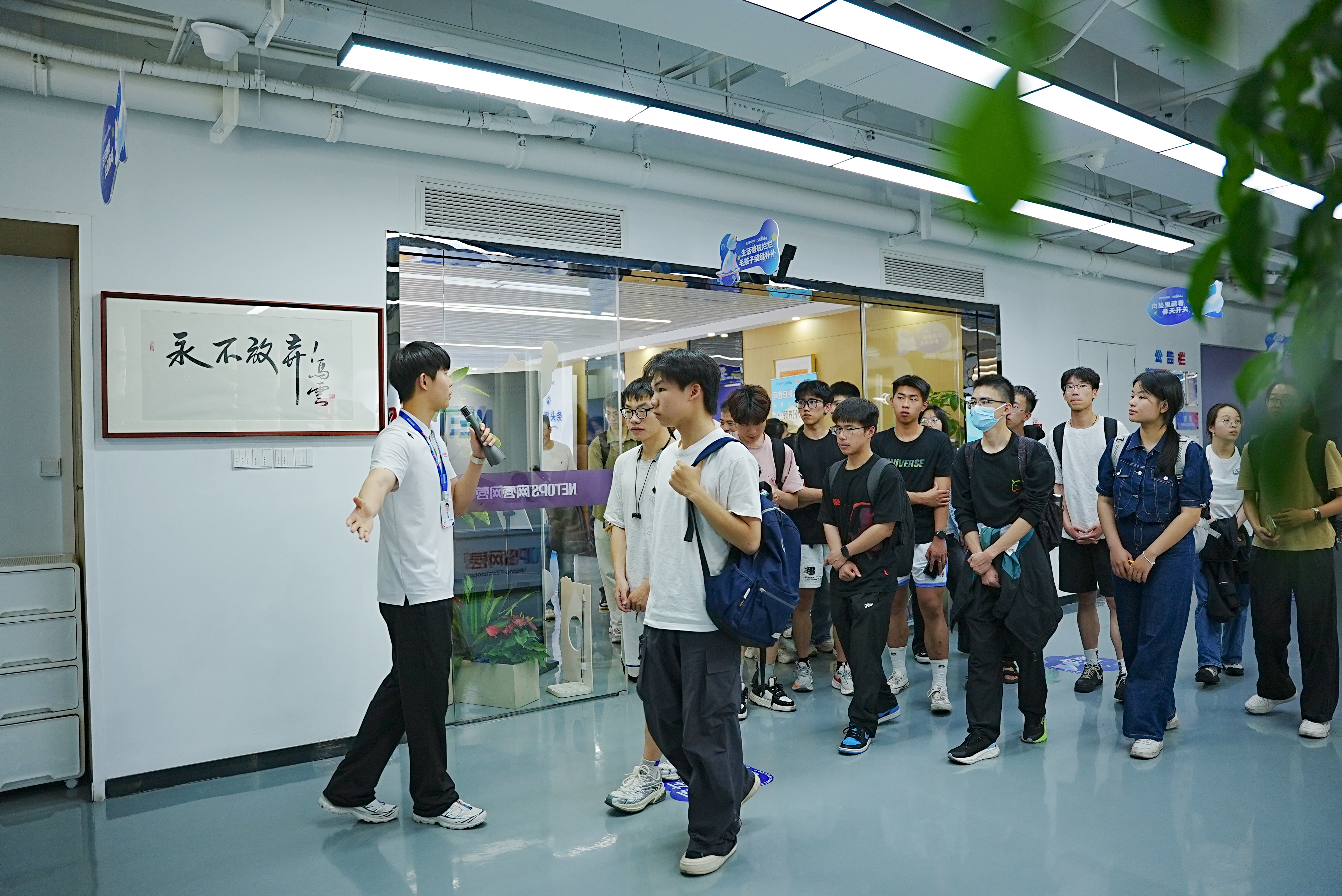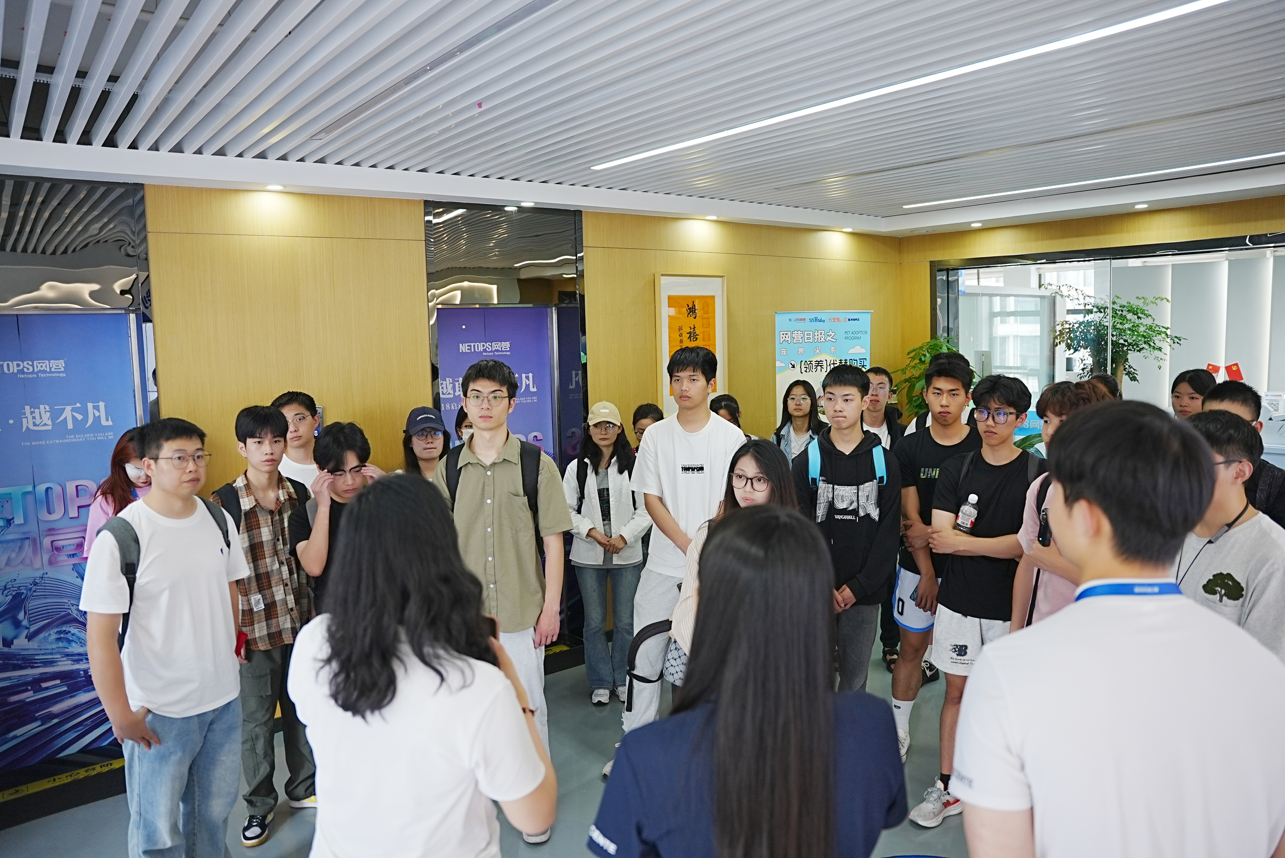 在工作人员的引导下,师生参观了网营科技的办公环境、核心业务展厅及数字化创新实验室。公司负责人详细介绍了企业发展历程、业务布局及在电商服务、AIGC技术应用等领域的特色成果。学生现场体验了AI内容生成工具的操作流程,并参与直播场景模拟实践,直观感受行业前沿技术的落地应用。