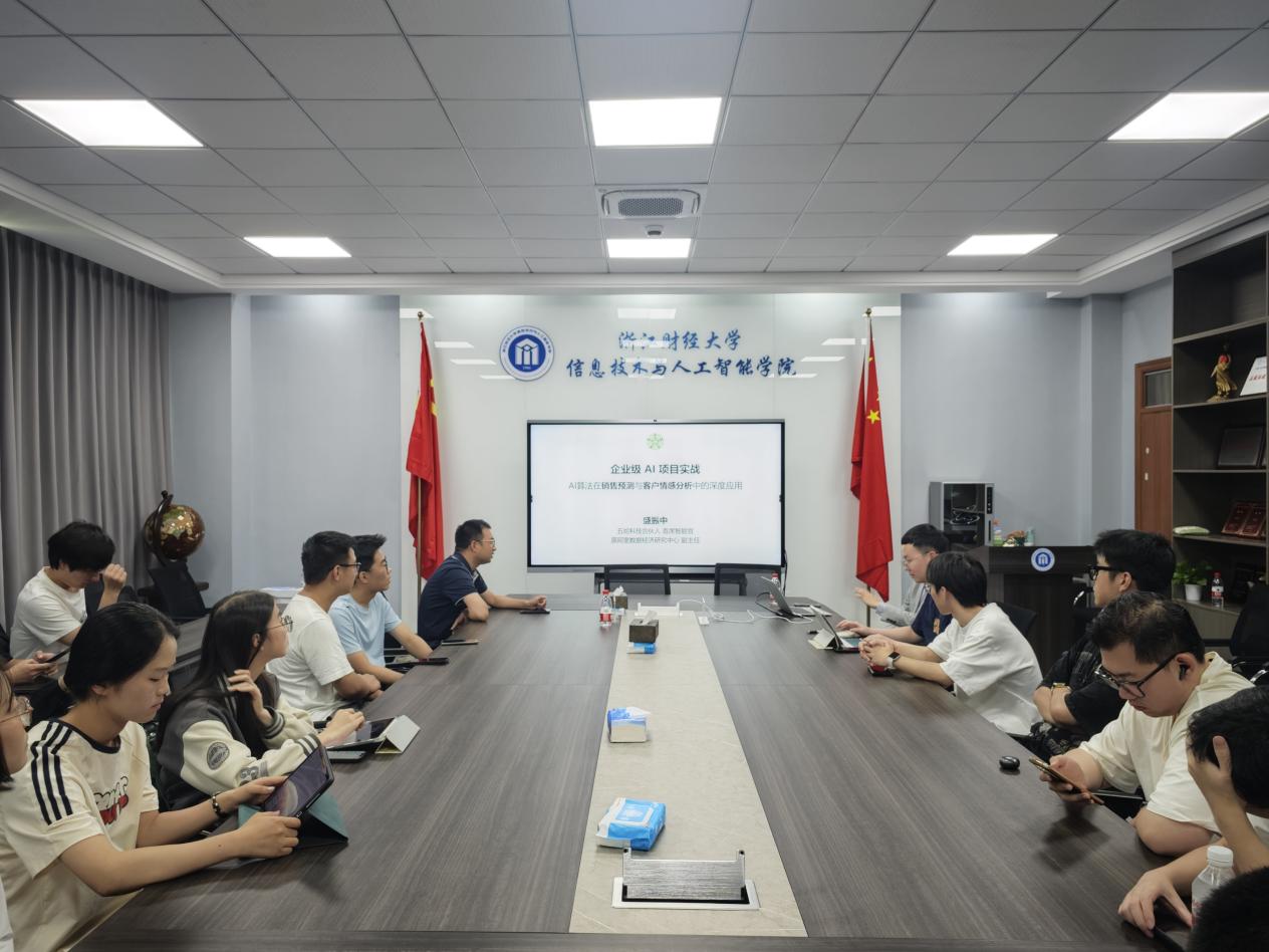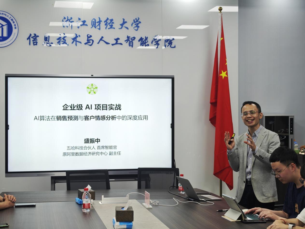 于 9 号楼 404 会议室成功举办了 “企业级 AI 项目实战 ——AI 算法在销售预测与客户情感分析中的深度应用” 讲座。本次讲座特邀五哈科技合伙人盛振中先生作为嘉宾,吸引了众多师生参与。