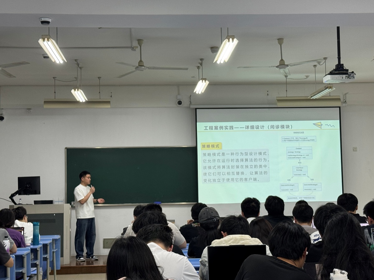 课程开始前,彭老师围绕课程学习现状、实践与理论的关联、企业实践需求与教学介入三个方面展开前期调研,调研数据为本次课程安排和后续课程优化提供了有效依据。基于调研结论,孔老师结合自身经历,从课程回顾、工程案例实践、校园与企业项目差异、求职及考研经历等方面进行细致分享。他着重介绍企业软件系统研发的项目周期与角色协作,并以AI问诊案例,深入讲解需求分析、方案设计、整体设计、详细设计等环节。随后,从代码功能实现角度,通过“拆分代码Bug”“服务器宕机”“流量暴增”“恶意攻击”“大数相乘”5个场景,比较分析校园知识与企业实践的异同。课堂上,学生们认真听讲,不少同学认真记录,积极与孔老师互动。课后反馈显示,同学们对课程中抽象的理论知识理解更加透彻,也掌握了许多实用的工程实践技巧,此次分享有效填补了同学们对企业真实开发场景认知的空白,为后续《软件设计与体系结构》课程的学习打下了坚实的实践基础,也让课程内容与企业实际需求的结合更为紧密。