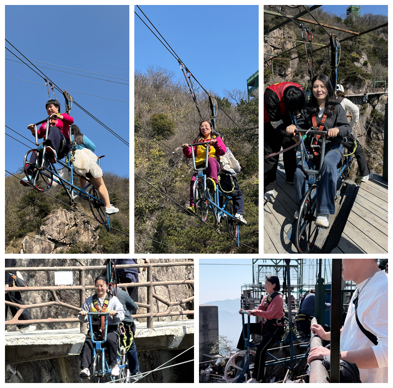 抵达海拔千米的安吉云上草原后,大家立刻被眼前壮阔的自然景观所吸引。这里山峦起伏,云雾缭绕,空气清新,宛如仙境。女教师们兴致勃勃地体验了景区的各项特色项目。她们有的结伴漫步在悬空而建的悬崖栈道上,俯瞰群山,挑战自我,感受“一览众山小”的豪迈;有的在广阔的青青草原上沐浴阳光,呼吸新鲜空气,与萌宠亲密互动,享受难得的悠闲时光;还有的在高空秋千和彩虹滑道上放飞自我,用尖叫与欢笑释放压力,展现出课堂之外活力四射、勇敢无畏的一面。