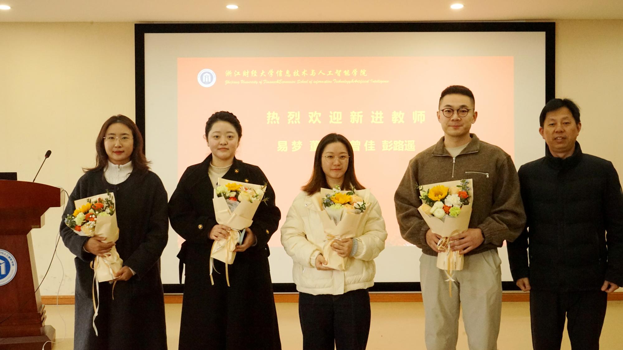 (张帅院长为新进教师曾佳、彭路遥、易梦、董起豪等老师赠送鲜花)
