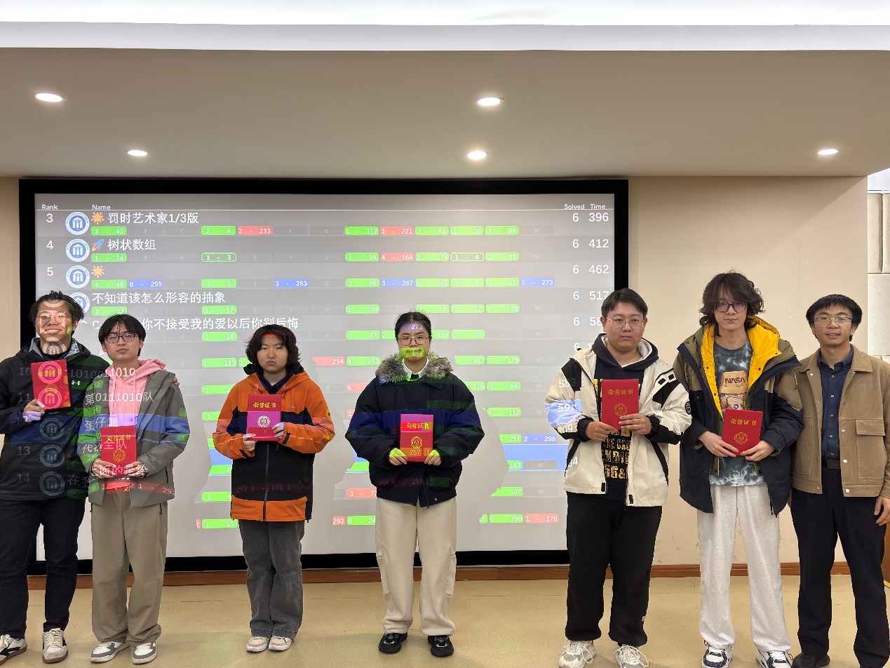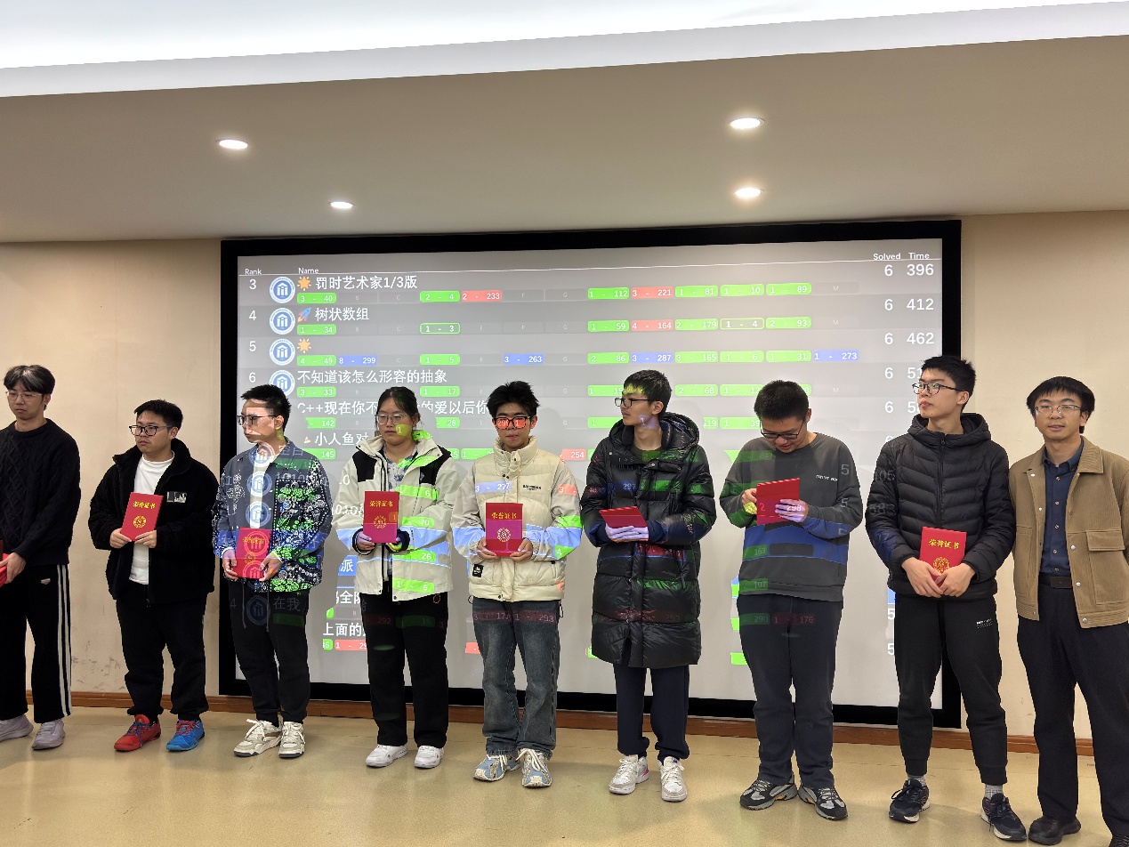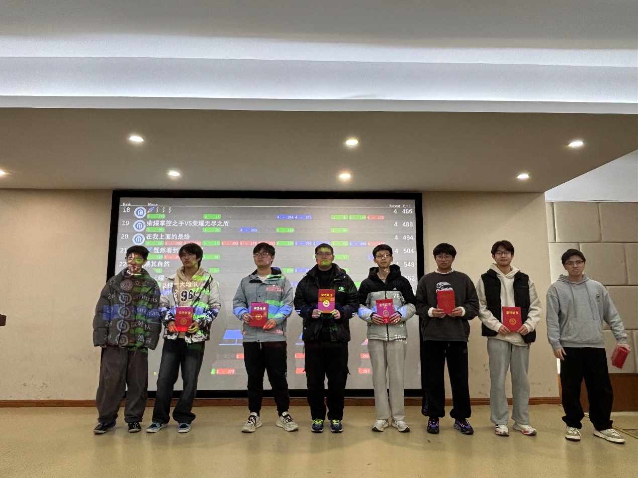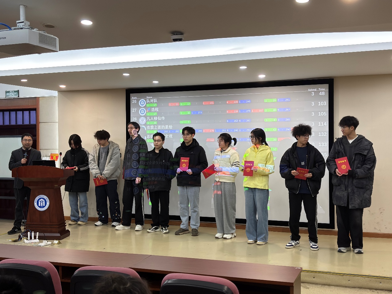 17:00,竞赛准时落下帷幕。闭幕式上,命题组负责人对赛事整体情况进行总结,并详细讲解题目思路与解题方法,为同学们后续复盘提升提供清晰指引。在紧张的滚榜环节结束后,获奖名单正式揭晓。本次比赛共有88名同学获奖,其中一等奖14人(7支队伍)、二等奖29人(13支队伍)、三等奖45人(20支队伍),并评选出“最佳新生队”。陈琰宏、陈勇老师以及命题组林煜超、王强、陈君豪、赵子腾同学为获奖队伍依次颁奖,鼓励同学们再接再厉,不断进步。