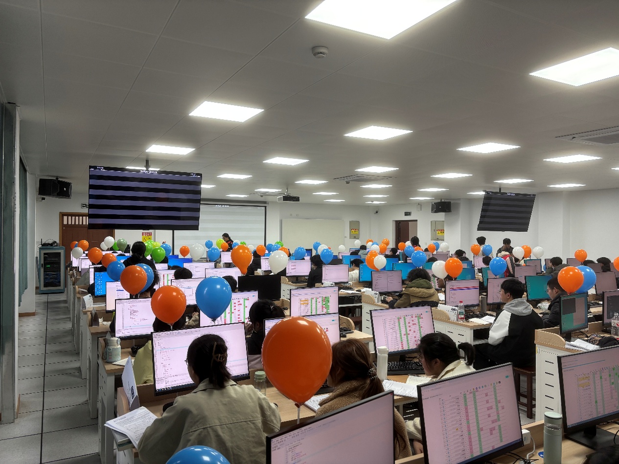 本次竞赛于 12:00 正式开赛,长达五小时的赛程中,各参赛队伍争分夺秒、默契协作,在代码世界里攻坚克难、集智解题。赛场特设趣味气球奖励机制,选手每成功解出一题,志愿者便送上对应颜色气球,每道题目首个作答正确的队伍还可收获专属 “首杀气球”,现场氛围紧张而热烈。在全体工作人员与志愿者的细致保障下,赛事全程井然有序、稳步推进。