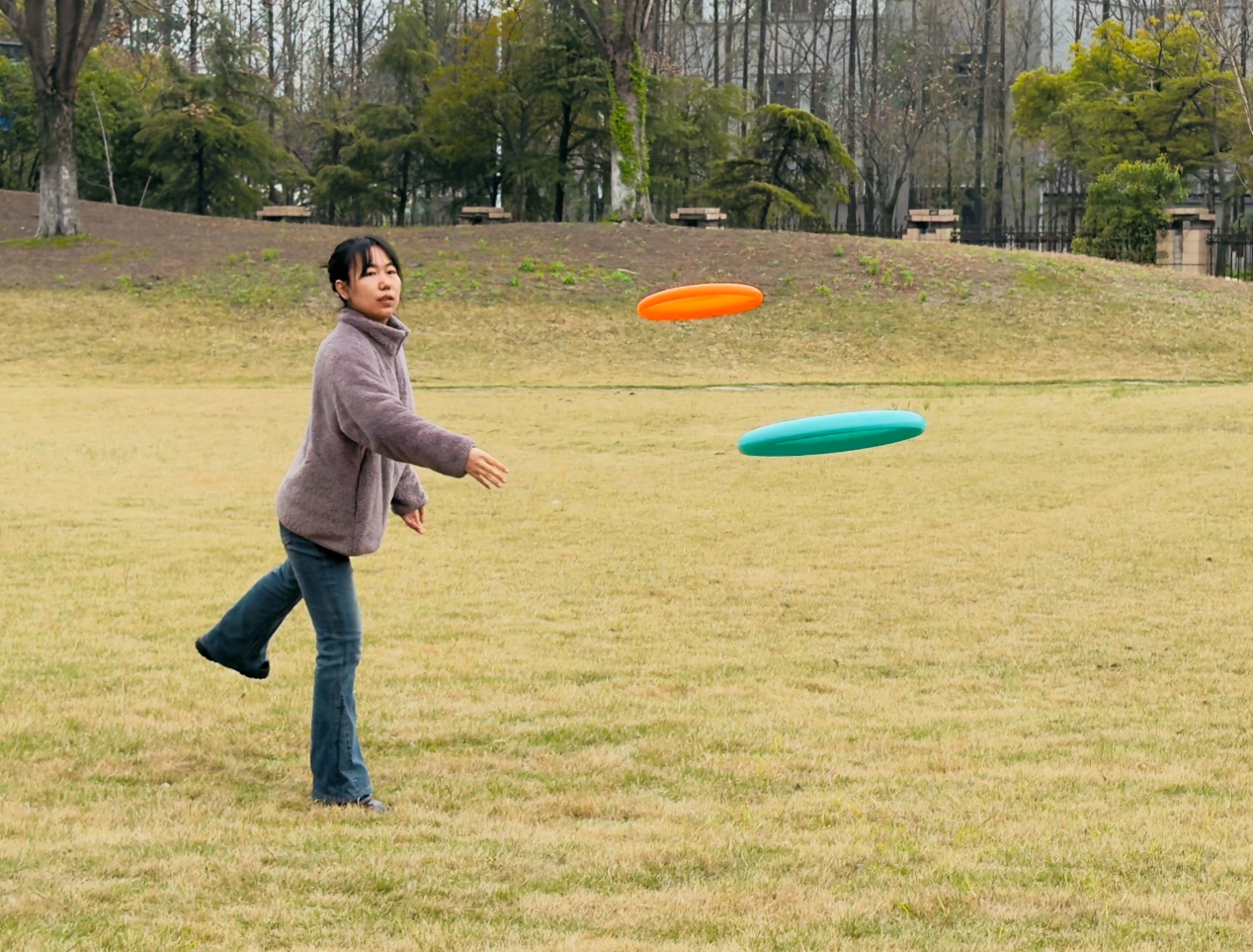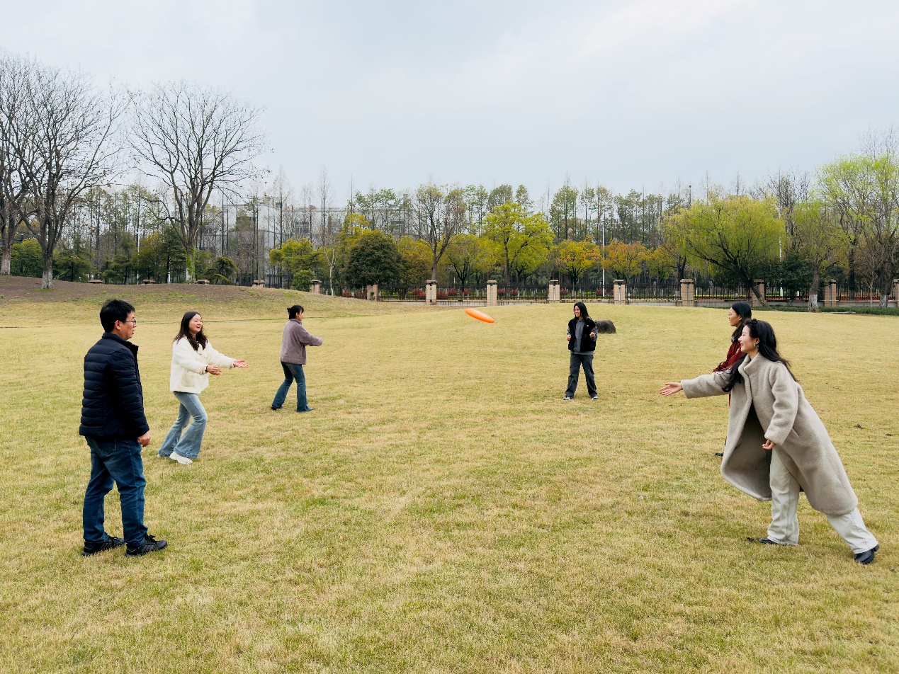 活动开始前,大家进行热身运动,并认真了解飞盘的基本技巧与比赛规则。飞盘运动兼具竞技性与趣味性,尤其强调“飞盘精神”——自律、尊重与公平竞争。在分组练习环节中,老师们从最初的生疏投掷,到逐渐掌握正手、反手传盘技巧,场上笑声不断,气氛轻松热烈。