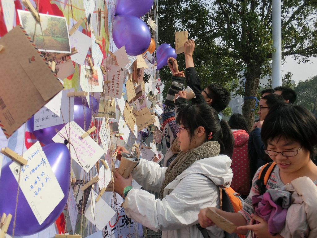 学生社团管理中心在校体育馆门口举办了“三行情书”活动,活动以“情书抒情,同寝情同——‘三行情书’让我们一起抒写家的温馨”为主题,希望借此活动让同学们尽情抒发自我情感,增进彼此的友谊和情意。
