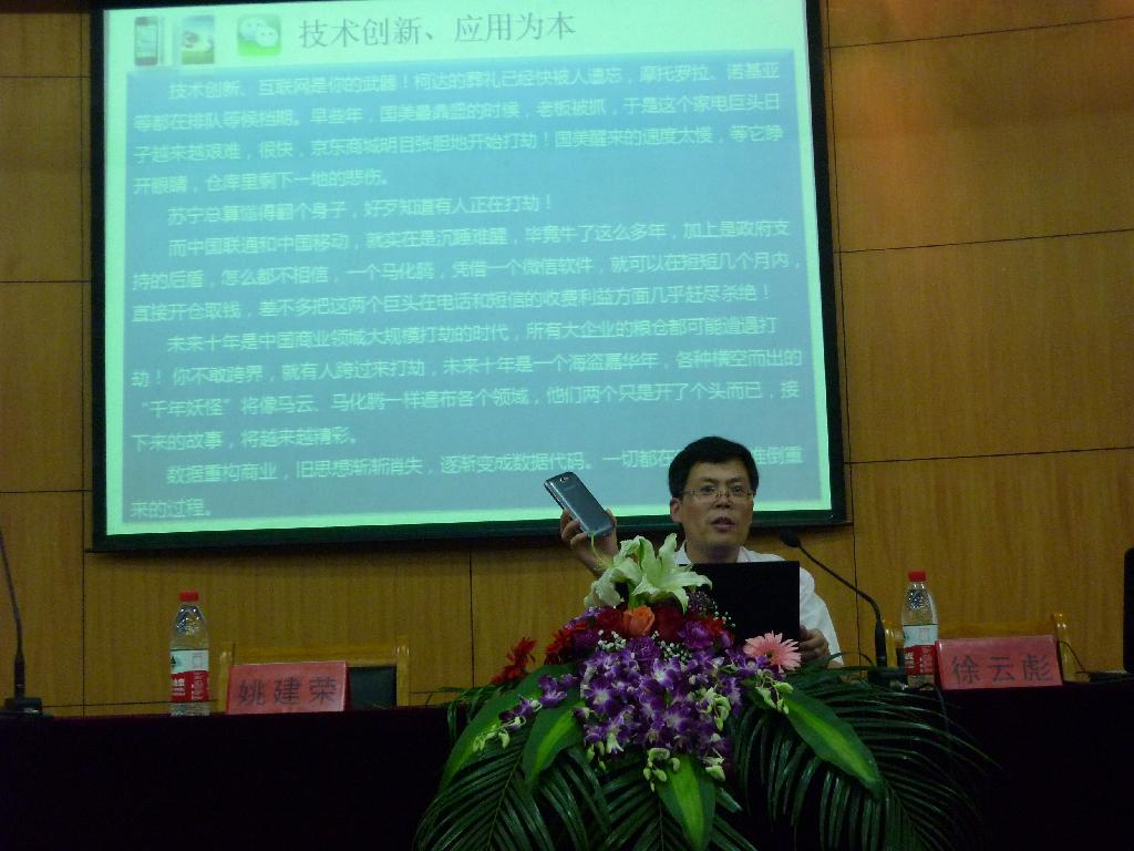 本次CIO大讲堂分“打造IT新职场”、“Take It Easy”和“提问环节”三大环节进行。首先,徐教授介绍了世界500强企业——浙江物产集团的BI系统,详细介绍BI系统的七大主要优势,如:通过货币资金管控,提升资源效益;通过营销结构分析,提升盈利水平等,并重点阐述了当前信息化管理对企业发展的重要意义,深入浅出道出:“这就像同学们在学习中只有多与比自己更好的同学交流才能获得更大进步!企业也一样,需要与更高水平的企业对照、学习才能获得发展”。随后,徐教授主要为大家介绍了两类技术创新应用,一是物联网与大数据,二是移动化与跨界应用。技术创新,应用为本,“手机赶超计算机,移动互联无处不在,诺基亚的衰败大部分就是因为其技术创新未能跟上时代步伐。”科技发展日新月异,只有熟练、巧妙地优化和提升信息化能力才能使企业在激烈的市场竞争中立于不败之地。