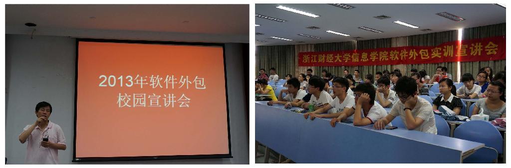 在A-201举行了“2013软件外包实训校园宣讲会”。浙大网新和杭州归谷两家知名的软件外包实训机构应邀作了宣讲,宣讲会由信息棋牌 APP