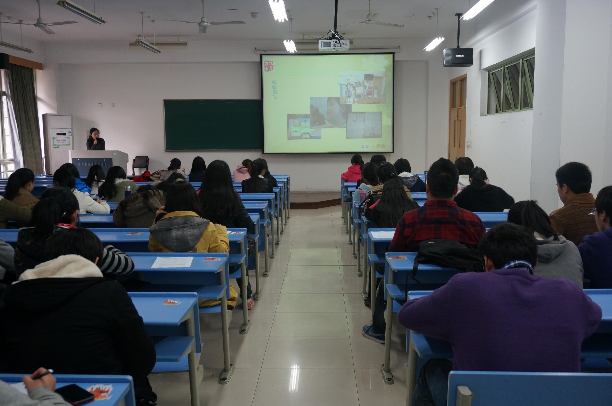 在简单的自我介绍之后,学姐先向同学们展示了在宝兴县支教的照片,照片上志愿者们共20人,他们心中怀爱,不远万里而来。数十小时的车程,艰苦的生活环境,疲惫中带着泪水,但他们依旧面带微笑。