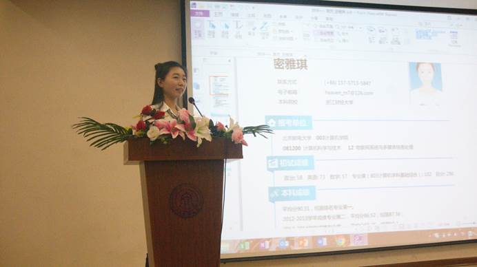 的王钰学姐也为大家详细讲解了申请国外研究生的注意事项及方法。特别的是,顺利考上同济大学管理科学与工程专业的孔祥豆学长专门为同学们印发了一些传单,上面列出了他推荐的若干关于考研的微信号、微博、视频和考研辅导书。他强调了英语作文的重要性并提到了考研过程中同学互相激励的作用,孔祥豆学长以过来人的身份警示大家,考研重要的不只是结果,考研的过程更重要,不管结果如何,我们都能从中学到很多。而考入北京邮电大学计算机科学与技术专业的密雅琪学姐则向我们强调了复试的重要性以及她在复试中逆袭的经验。她告诉我们要和导师经常交流联系,摆正心态,考研的复习过程中要脚踏实地,切忌浮躁。