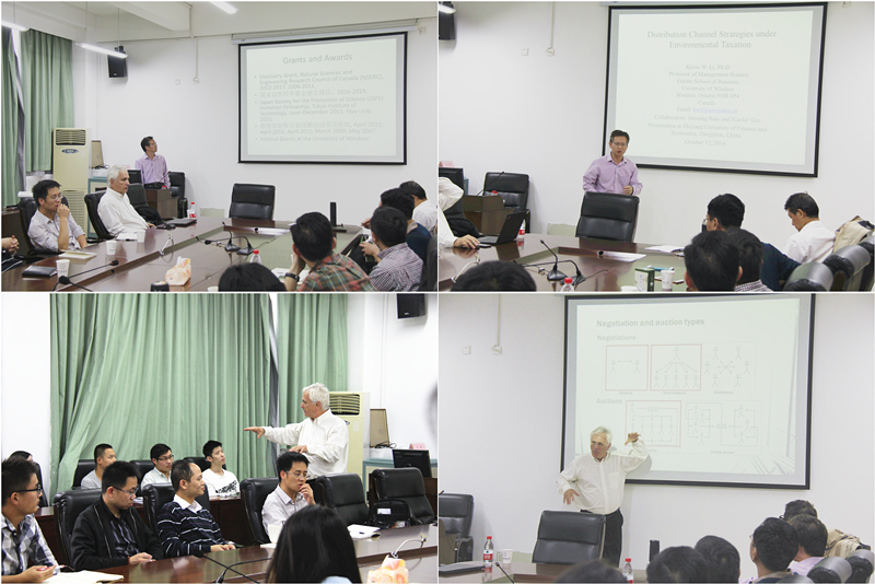 Gregory E. Kersten教授首先提问在座师生,随后分别就拍卖、谈判、政府采购、供应链管理等问题进行探讨,为大家生动有趣的介绍了他的研究领域和问题。Kevin W. Li教授分析了环境、税率与供应链选择的关系,现场就供应链选择的其他因素以及参数的设定等问题展开了激烈的讨论。