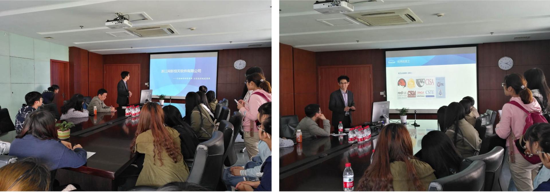 到达网新恒天办公大楼后,网新恒天副总裁祝晓春博士亲自向同学们介绍了网新恒天的主营业务、发展历史、棋牌APP和人才需求等方面的情况,并详细回答了同学们有关技能需求、实习招聘、面试技巧等方面的提问。之后,同学们在HR带领下,参观了公司的软件开发办公区域,亲身体验了IT工程师的工作和生活环境。高大挺拔的办公大楼、宽敞明亮的工作环境、舒适齐全的休闲场所给同学们留下了深刻的印象。