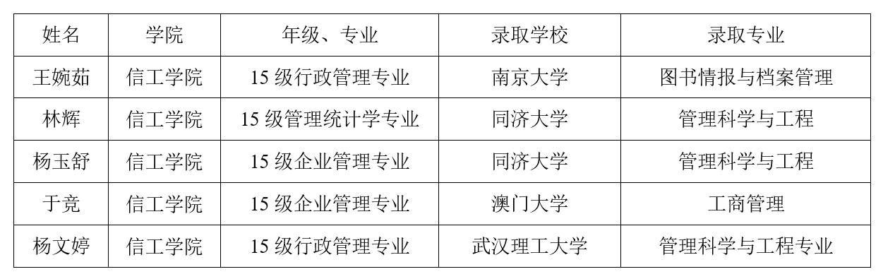 15级硕士研究生王婉茹、杨玉舒、林辉、于竞、杨文婷等5名同学分别成功考取了南京大学、同济大学、武汉理工大学、澳门大学等985、211和境外名校博士研究生,考博率由去年的28.6%大幅提升至今年的50%,创历史新高。