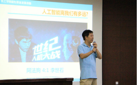 张老师通过物联网、云计算、大数据、人工智能等四个当前最热门的IT技术,并引用霍金、马斯克、李开复、马云等著名科学家和企业家的预言,阐述了人工智能在未来几年内将会带给人类工作生活的巨大机遇与挑战。为向新生们展示人工智能的强大作用,张老师用几个有趣的短视频,介绍了京东智能配送机器人、无人超市、智能银行、智能翻译、财务机器人等最新的人工智能技术应用案例,告诫同学们未来人工智能技术将会替换人类大部分的低端体力和脑力劳动。“上帝关闭一扇门的同时,也会为你打开一扇窗”,张帅老师特别强调说,人工智能技术在替代一些传统岗位的同时,往往也会创造出一些新的高技术就业岗位,比如说信息系统管理与维护、大数据分析、人工智能算法开发等。