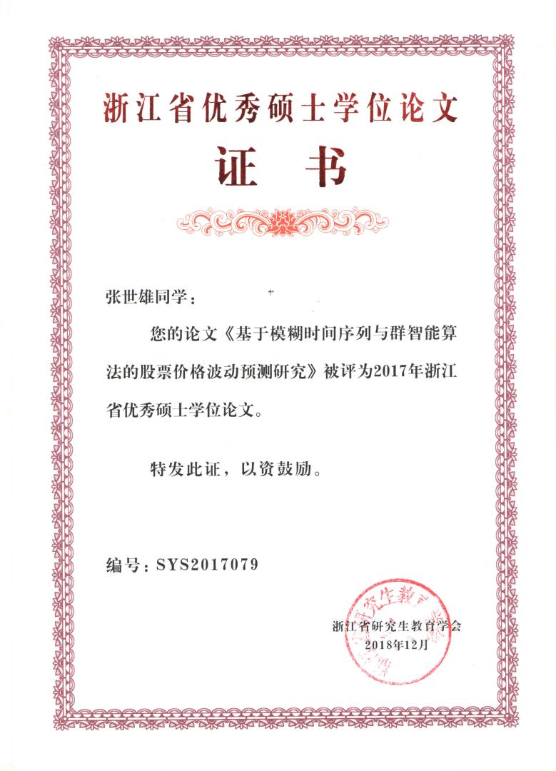 管理统计学专业2014级硕士毕业生张世雄的硕士学位论文《基于模糊时间序列与群智能算法的股票价格波动预测研究》被评为2017年浙江省优秀硕士学位论文。此次评选共评出21篇优秀博士学位论文,94篇优秀硕士学位论文,棋牌 APP