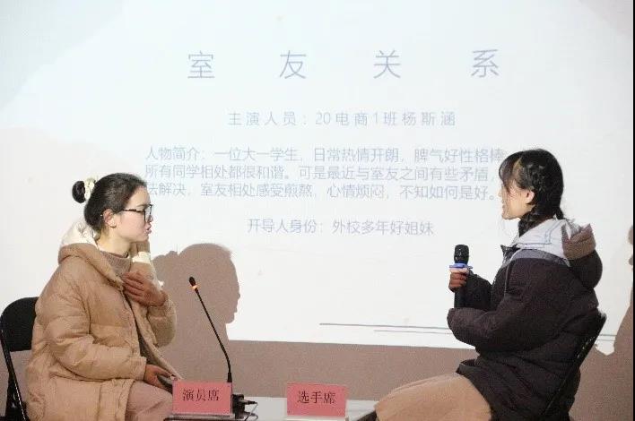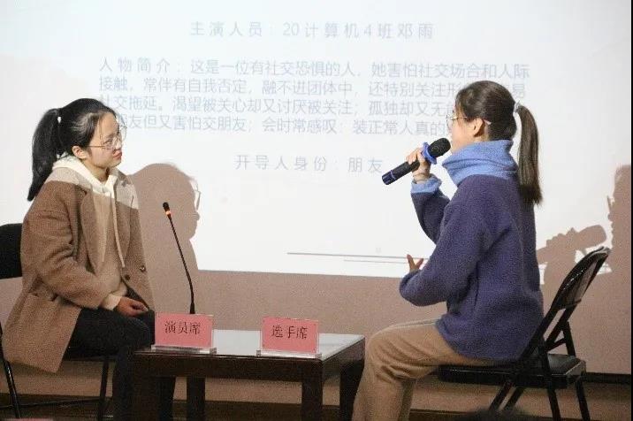 此次朋辈心理辅导大赛主要通过情景演绎的方式呈现日常学习生活中的心理问题:参赛选手在题库中进行抽题,由演员进行角色扮演,模拟真实场景,参赛选手从朋辈互助角度与演员开展谈心谈话,给予沟通交流和心理辅导。
