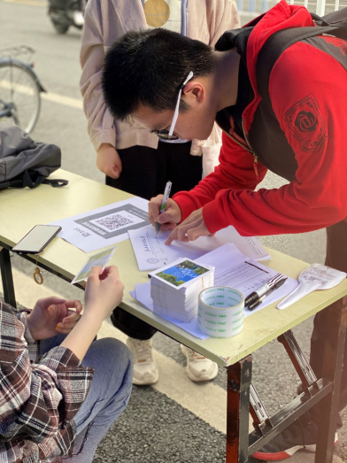 园区工作站在20级各寝室楼下开展报名和闲置物品征收。期间,工作人员收取和清点物资,并明确好物品的相关信息。工作站赠予所有捐赠物品的同学们小卡片,以留念致谢。