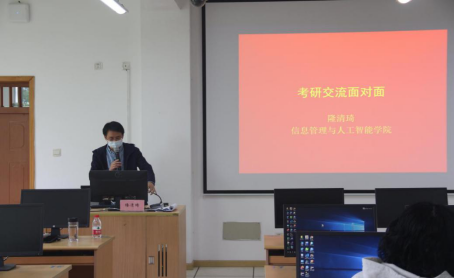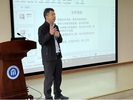 考研情况、考研方向选择以及考研策略。希望同学们能够做好考研复习计划,及时关注目标院校的考研分数和招生计划,注重劳逸结合,加强身体锻炼,对自己定位清晰准确。陈伟锋、宋海裕、陈明晶和田聪分别围绕目标院校及专业选择、制定复习计划、查找资料、调整心态等方面谈了自己的亲身体验和感受。咨询会干货满满,赢得了同学们的阵阵掌声,让同学们更加明确考研的方向,进一步增强了考研的信心和决心。