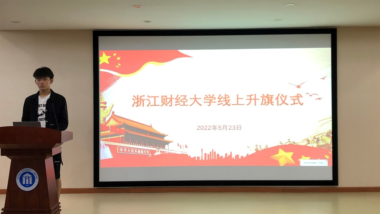 在庄严雄壮的国歌声中五星红旗冉冉升起,参会的同学们在屏幕前正装肃穆,向五星红旗行注目礼,为我们伟大祖国的日益繁荣昌盛而自豪。