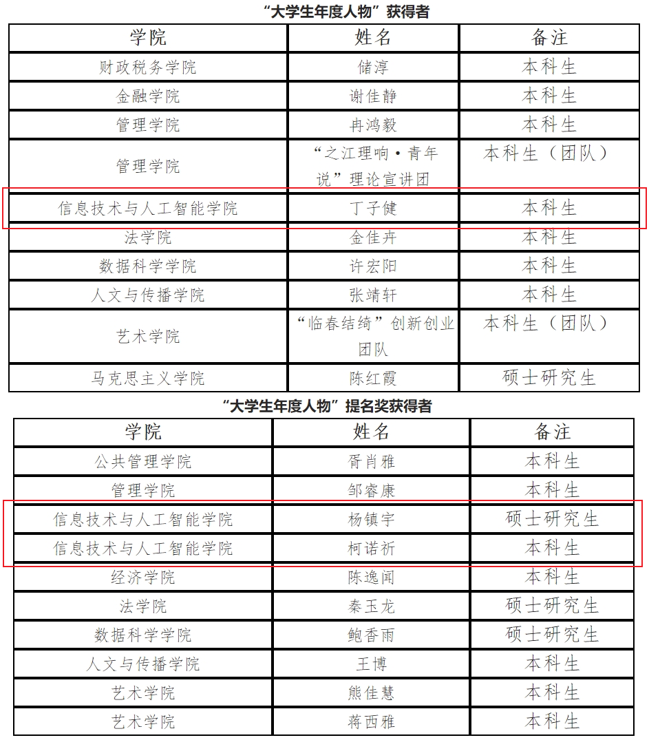 本科生丁子健以德智体美劳各方面的优秀表现和丰富的学术成果在全校众多优秀学生中脱颖而出,获评“大学生年度人物”荣誉称号;硕士研究生杨镇宇、本科生柯诺祈获评“大学生年度人物”提名奖荣誉称号,展现了信智学子昂扬向上的精神风貌、踏实进取的优良学风,发挥了积极的榜样作用。