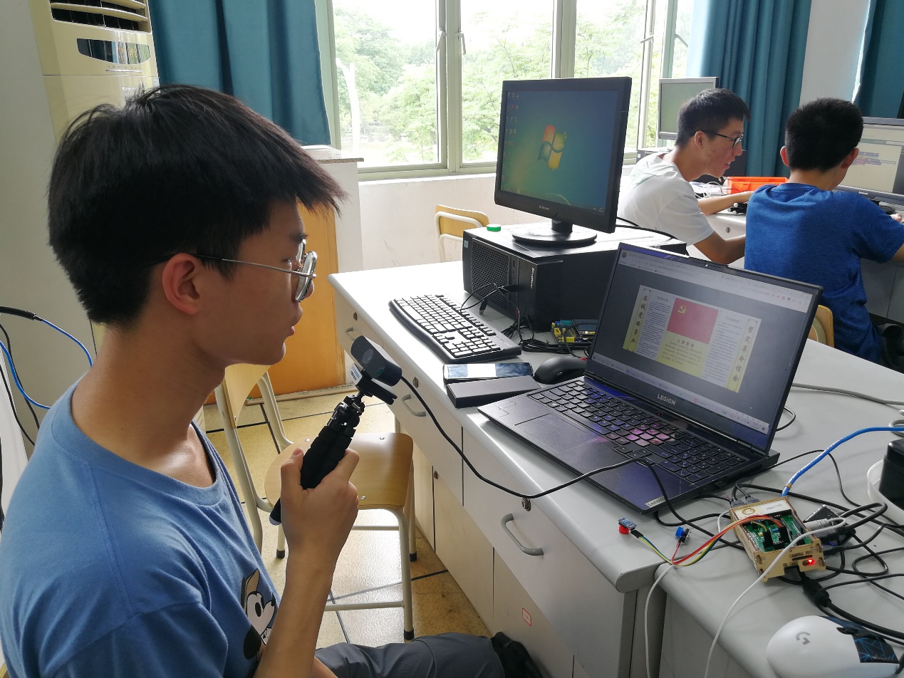 的张文俊同学在朱老师的指导下设计实现了一个虚拟仿真点歌台,通过物联网播放出“没有共产党就没有新中国”等振奋人心的红色歌曲,并结合语音识别、文字识别、机器翻译等技术编写程序将朗读的入党誓词在屏幕中显示出了中英文不同版本。三位同学表示:“朱凌老师形式新颖、妙趣横生的通识课不仅让我们能马上检验自己的学习成果,还能近距离地体验到人工智能、物联网等前沿信息技术在智能时代中的广阔应用;同时,在建党百年这个特殊的时间段,朱老师带领我们重温党史,感受党的奋斗历程和伟大精神,让课堂学习更具有丰富的内涵与意义,同学们也更加珍惜今天来之不易的幸福生活。”
