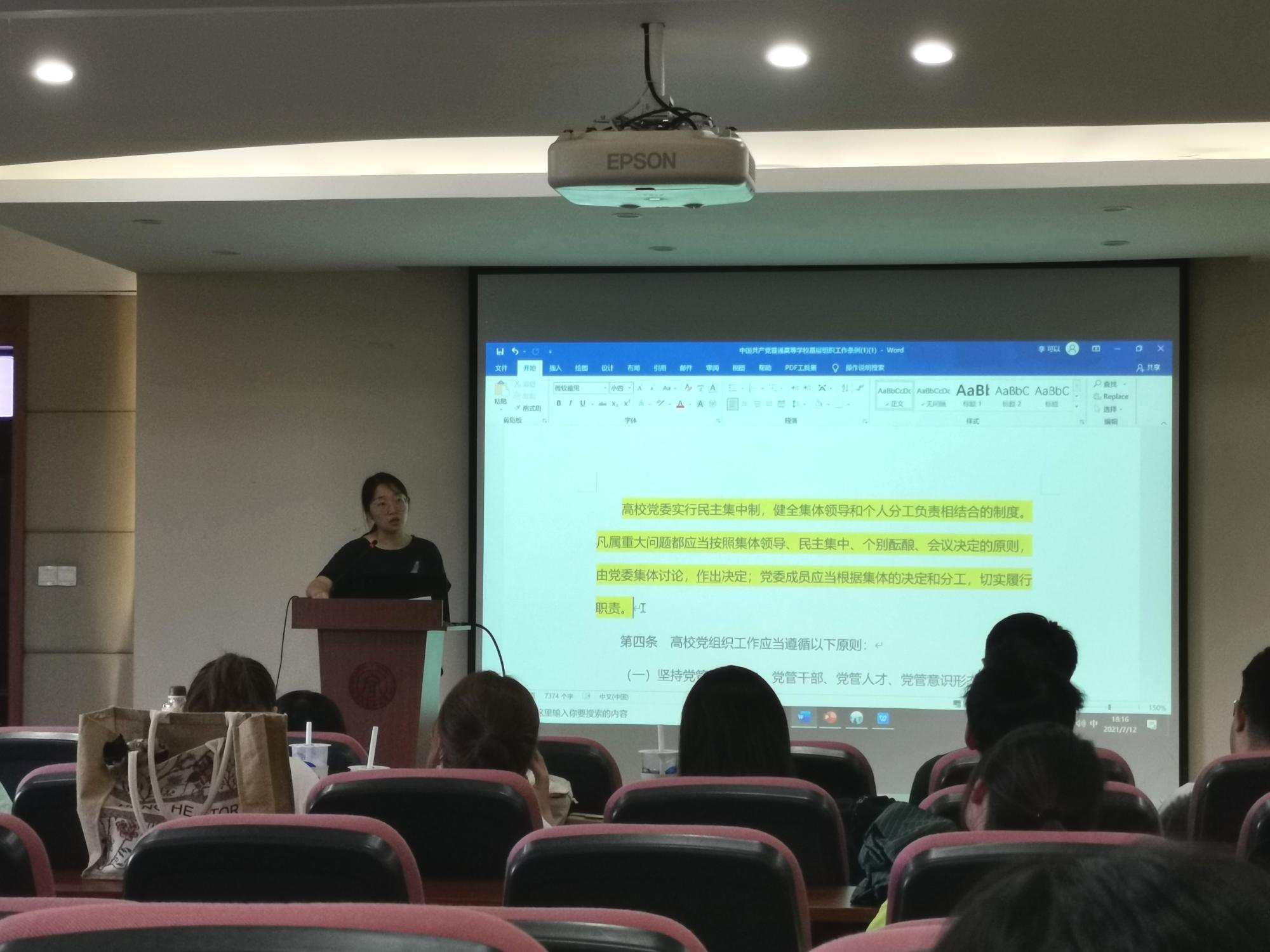 首先,李靓老师报告了党支部上半年的工作情况,特别是开展党史学习教育情况,通报了党支部检视问题情况,并强调支部将根据目前存在的问题进行党性分析,明确整改方向。