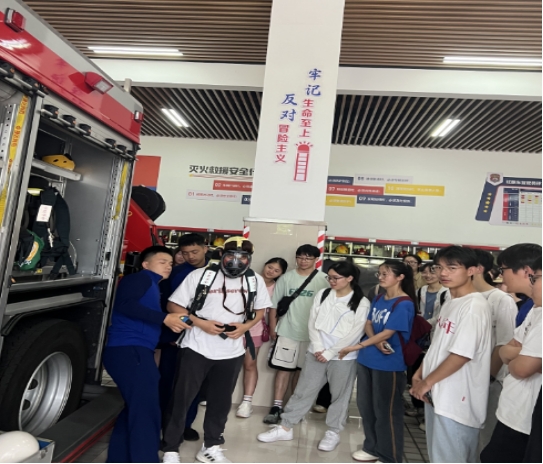 师生们参观了消防车辆、器材装备,并详细讲解了各种消防装备器材的使用方法、功能、用途,并针对火灾现场处置与应急逃生等内容进行讲解。